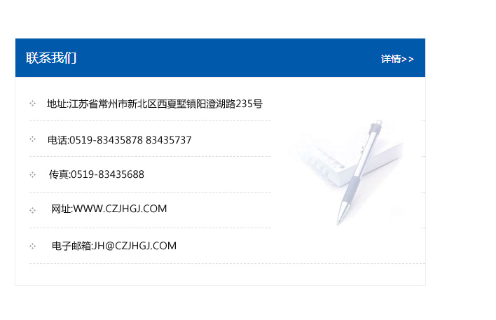 地址:常州市新北區友邦商務大廈1幢16、17層  電話:0519-85101652  傳真:0519-85112595  郵編:213022  網址:www_cz-jiayue_cn.tonghuicc.com  郵箱:xiajifengaa@163.com